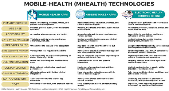 Figure 2. Comparison of mobile health technologies described in the results of this study. Comparisons were presented according to categories inherent to the technology, such as accessibility, technology, and interoperability. Categories of cost, customization, and clinical integration are also mentioned [25,26,27,28,29].