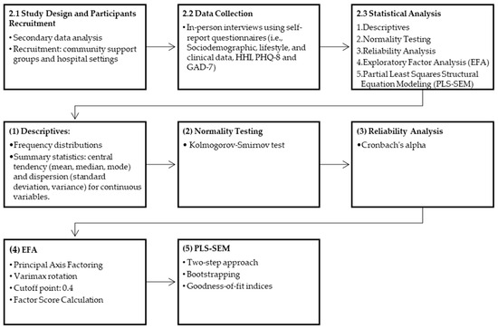 Trained research assistants invited individuals to participate in the study, and those who agreed to participate provided written informed consent. After recruitment, trained research assistants coordinated an in-person interview to complete the required questionnaires. Participants completed a self-reported pen-to-paper questionnaire in Spanish, supported by doctoral clinical psychology students. The study’s procedures and baseline preliminary results were reported elsewhere [40]. Figure 1 illustrates the research methodology, outlining the study design, data collection procedures, and statistical analysis procedures.