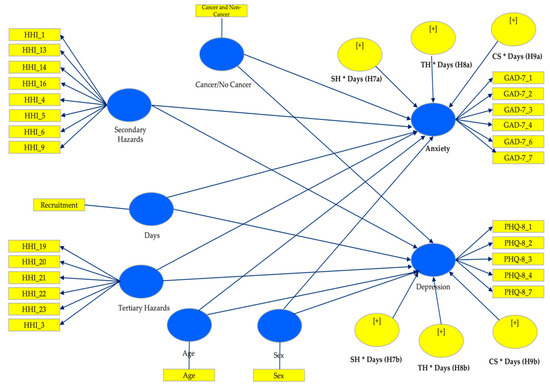 Table 7 presents the results of the direct effect hypotheses examining the relationships between predictor variables and anxiety (Anx) and depression (Dep). Significant direct effects (p < 0.05) were observed for several hypotheses. Specifically, sex (Sex) significantly negatively influenced anxiety (β = −0.121, p = 0.019), supporting H1a, but did not significantly affect depression (Dep) (β = −0.089, p = 0.134), as per H1b. Cancer status (CS) positively influenced both anxiety (β = 0.198, p < 0.001) and depression (β = 0.226, p < 0.001), supporting H3a and H3b, respectively. Moreover, “Tertiary Hazard” (TH) showed substantial positive effects on both anxiety (β = 0.405, p < 0.001) and depression (β = 0.349, p < 0.001), supporting H6a and H6b, respectively. Conversely, age, days, and secondary hazards (SHs) did not show significant direct effects on anxiety or depression. These findings highlight specific demographic and hazard-related factors significantly influencing psychological outcomes, underscoring their importance in understanding anxiety and depression in the studied population.