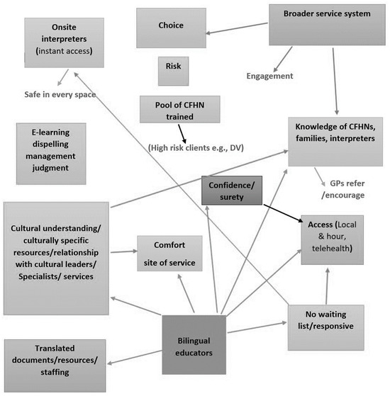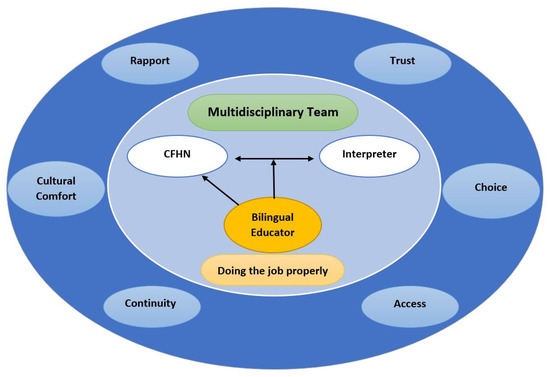 The co-design research approach provided opportunities for the study participants (CFHNs and healthcare interpreters) to share their knowledge and experiences of providing child and family nursing services to CALD families with limited English proficiency, requiring the engagement of interpreters. The highlight of the proposed model is how the role of a bilingual educator—a core element of both the CFHN and healthcare interpreter models—can facilitate nurse–mother interactions directly, as well as nurse–mother–interpreter interactions. There is a need to build the capacity of healthcare staff (CFHNs and healthcare interpreters) and systems to work with and care for CALD families with LEP in a collaborative and multidisciplinary team. The focus of a multidisciplinary team approach to care is to ensure that CFHNs and healthcare interpreters can engage and plan care together. To achieve this, healthcare interpreters require access to clients’ data, information, and medical history so they can work efficiently with nurses to ‘do[ing] the job properly’. This study identified that ‘doing the job properly’ also meant providing services in the context of relationships that facilitated rapport, choice, cultural comfort, continuity of care, access, and trust.