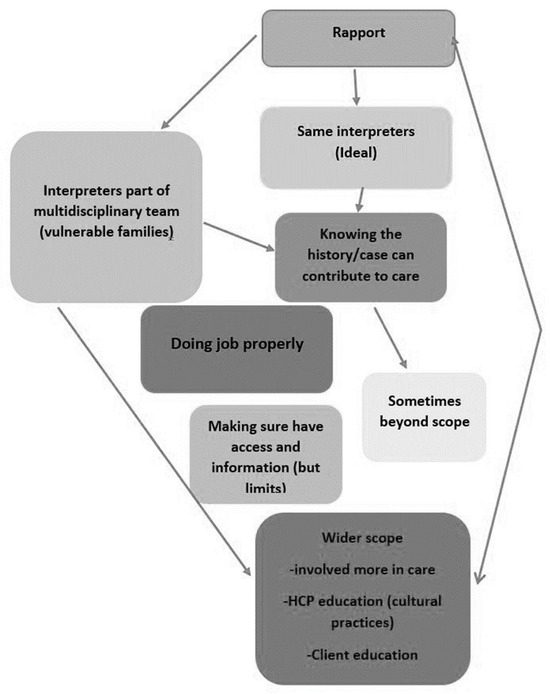 Overall, all of the interpreters agreed that one size does not fit all. They suggested that working in a multidisciplinary team and having access to their client’s medical history could be beneficial because time spent retelling their story could be better spent building mother–nurse–interpreter rapport.