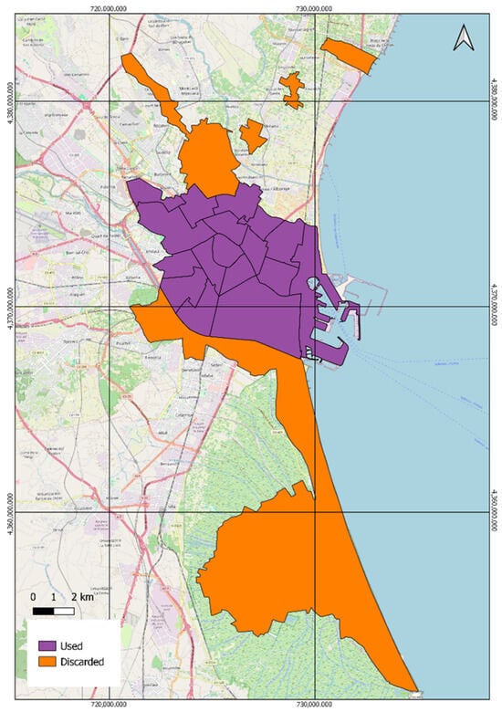 Figure 1 shows the 17 districts that have been included in the analysis (purple polygons in Figure 1), accounting for a land area of approximately 56 km2, with the exception of two districts, Poblats Nord and Poblats Sud (orange polygons in Figure 1), due to data availability limitations or data scarcity in the passive dosimetry campaign, which did not allow enough map continuity to perform the required analysis. This exclusion highlights the challenges in data collection and the importance of comprehensive monitoring systems to ensure accurate assessments.