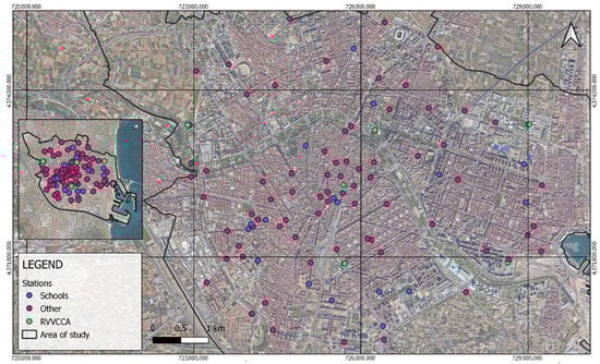 A total of 99 sensor stations were deployed in the study area, as can be seen in Figure 2: 17 sensors were placed in schools, another seven sensors were placed next to the official stations of the Valencian Network for Monitoring and Control of Air Pollution (RVVCCA), and the remaining ones were located throughout the city to represent it as much as possible. The criteria for selecting the sensor locations followed the macro- and micro-implementation principles established by the European Directive 2008/50/EC.