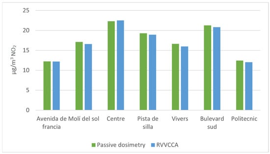The use of passive dosimetry for measuring NO2 concentrations in this study is validated through its comparison with the annual averages obtained from fixed air quality monitoring stations. As illustrated in Figure 3, the passive dosimeters’ measurements closely align with those of the continuous monitors, demonstrating that this method provides a reliable estimate of annual pollutant levels. Furthermore, passive dosimeters allow for greater spatial resolution, as they can be deployed in multiple locations across urban areas, providing a more detailed representation of local NO2 variations that fixed stations might miss.