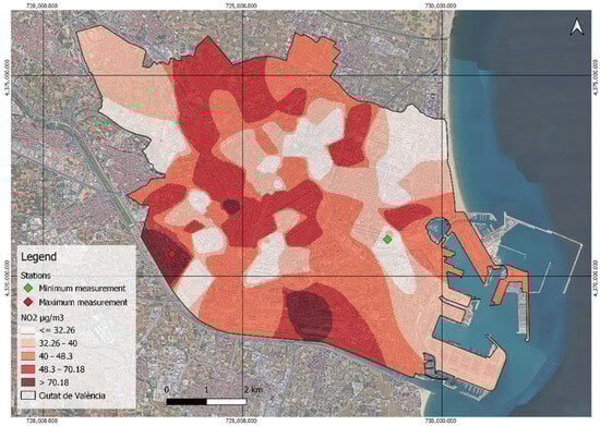 The measurements collected by the sensors used in the investigation range from 12.225 µg/m3 (located at the green point in Figure 4) to the highest average of 89.95 µg/m3 recorded by the sensor at the entrance to CV-36, known as the Autovía de Torrent (red point in Figure 4). The two areas of most notable NO2 concentrations highlighted in Figure 4 coincide with two major vehicle entrances to the city, i.e., main roads or motorways.