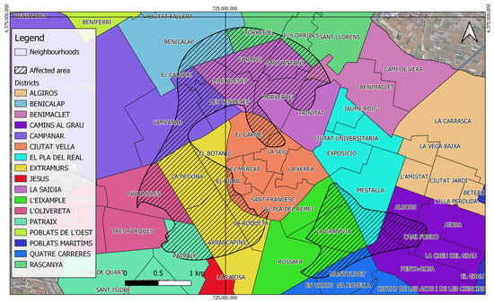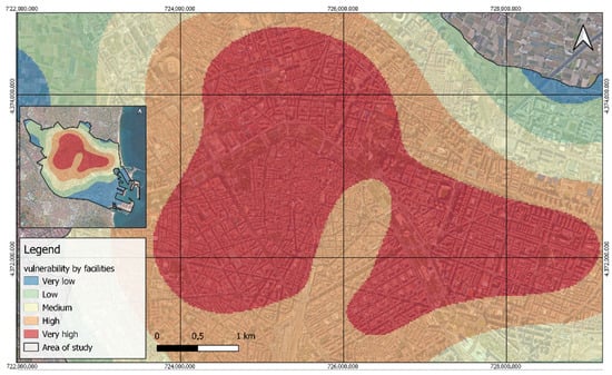 Regarding the identified areas of vulnerability concerning facilities, it is observed that the least vulnerable is the port region or Nazareth neighborhood, which is characterized by the scarcity of facilities related to the population groups studied. Similarly, the neighborhood of La Punta in the district of Quatre Carreres shows low vulnerability due to its composition of mostly market garden areas with few facilities. In contrast, the most vulnerable district is La Saïdia, including the extensive areas of Ciutat Vella, Extremurs, and El Pla del Reial, which are notable for their high presence of facilities, as evidenced in the heat maps in Figure 6. This result is explained by the weights assigned to facilities (Table 2) in these areas, highlighting their significant concentration.