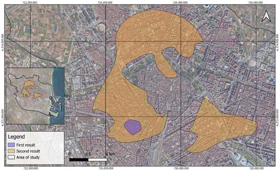 Based on the percentile ranking of air quality, the first result of environmental inequity zones identifies a more critical zone in Ciutat de Valencia, covering approximately 0.12 km2 (“First result” in Figure 7). This area, located between the districts of Extremurs and Arrancapins, has residential buildings and several avenues and is particularly notable for its air quality concerns.