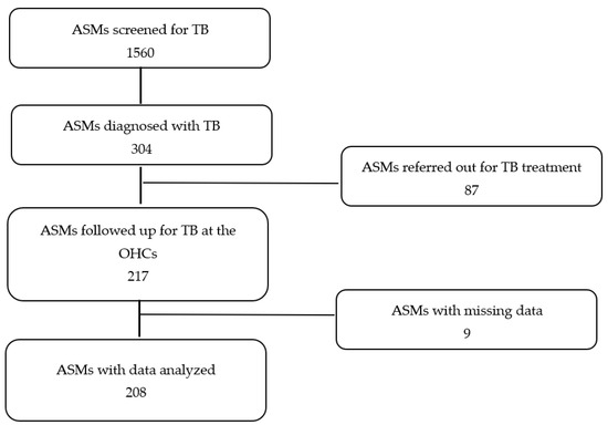The sampling procedure for study participants was as shown in Figure 1 below. We collected data from the two OHCs. In these facilities, 304 ASMs were diagnosed with TB. Of these, we excluded 87 records for ASMs who were referred for TB treatment and care outside the facilities. A further nine records were excluded for missing data in most of the variables. A total of 208 records were included in this study for analysis. During this period, no DR-TB cases were diagnosed; hence, all recruited patients had drug-susceptible TB.