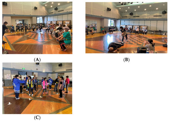 On the psychological side, theatrical interventions offer participants opportunities for emotional expression and social interaction, contributing to emotional relief and stress reduction. Taking on roles in performances boosts self-esteem and self-worth, enhancing life satisfaction and giving participants a greater sense of purpose. The theatrical intervention in one session consisted of three stages (Supplementary Table S1). The first stage focused on full-body stretching exercises and vocal exercises to warm up (Figure 1A). The second phase involved training to express emotions through body movements and facial expressions to release emotions (Figure 1B). In the third stage, the participants worked on their lines and practiced their dances during the first half of the period. They also brought their own props for use in the play or created their own if necessary. Each participant worked hard to find a role in which they excelled and collaborated to complete the play. In the second half, the participants practiced their plays, ensuring they had learned their lines and movements well and were in position with their counterparts (Figure 1C).