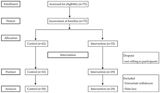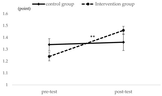 For variables with significant differences yielded in the former comparison tests, the analysis of variance for split-plot factorial design was subsequently applied to examine interactions between the groups (control group and intervention group) and time (pretest/post-test) for main effects. The F-value and the effect size (η2) were calculated as statistics for the analysis of variance for split-plot factorial design. SPSS Version 27.0 for Windows (SPSS INC., Chicago, IL, USA) was used for the analysis, and the level of significance was set at p = 0.05.