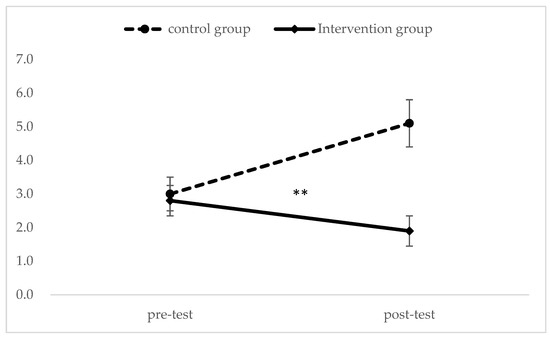 Main effect analysis of interaction regarding GDS-15 between the control group and the intervention group. ** p < 0.01.