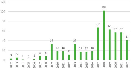 The first data that we observed are the volume of publication of the news analysed per year (Figure 1). In these 20 years, we identified an increasing evolution in the number of news items published on radon—particularly remarkable since 2017.