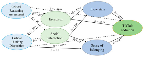 Path diagram analysis with Tiktok addiction as dependent variable. Arrows represent direct relationships. Solid lines indicate positive relationships, while dashed lines indicate negative relationships. Numbers beside the arrows indicate standardized regression coefficients (β). Critical Thinking Disposition (CTD); Cognitive Reflection Ability (CRA).