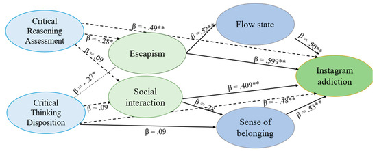 For TikTok, escapism (β = 0.62), sense of belonging (β = 0.53), and flow state (β = 0.51) were identified as significant predictors of addiction (see Figure 1). Conversely, critical thinking attitude negatively predicted addiction (β = −0.48), affirming its role as a mitigating factor. Similarly, for Instagram, escapism (β = 0.57), sense of belonging (β = 0.55), and flow state (β = 0.50) positively predicted addiction, while critical thinking attitude (β = −0.46) inversely predicted addiction (see Figure 2). Escapism, as positively correlated with addiction (r = 0.579 **), reflects a tendency for individuals to use social networks to avoid real-world stressors. Critical thinking, in contrast, can serve as a protective factor by helping users recognize when they are using social media as an escape mechanism, thereby reducing addictive behaviors. It is plausible that escapism and critical thinking operate on different psychological levels, where escapism may mediate the relationship between critical thinking and addiction where individuals with low critical thinking are more likely to engage in escapist behaviors, thereby increasing their risk of addiction.