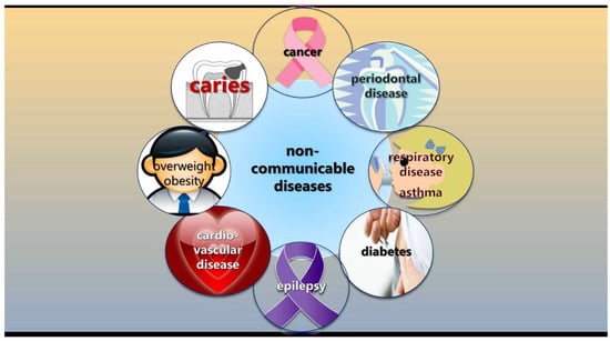 - Pitts, N.B.; Twetman, S.; Fisher, J.; Marsh, P.D. Understanding dental caries as a non-communicable disease. Br. Dent. J. 2021, 231, 749–753. [Google Scholar] [CrossRef] [PubMed]