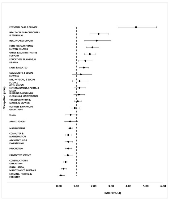 In gender-specific analyses by occupation, significantly higher than expected proportions of cases occurred among men employed in personal care and service (PMR 4.44, 99% CI 3.40–5.62); healthcare practitioners and technicians (PMR 2.28, 99% CI 1.79–2.83); healthcare support (PMR 2.17, 99% CI 1.48–3.00); food preparation and serving-related (PMR 1.93, 99% CI 1.59–2.31); office and administrative support (PMR 1.78, 99% CI 1.47–2.12); education, training, and library (PMR 1.52, 99% CI 1.14–1.97); and sales and related (PMR 1.44, 99% CI 1.19–1.70) occupations. Personal care service occupations include workers who attend to clients’ beauty, fitness, and other needs. Food preparation and serving-related occupations include workers who make and provide food and drink to customers. Sales and related occupations include workers who sell goods and services or connect buyers with sellers in a specific market, such as real estate or securities. Significantly lower than expected proportions of cases also occurred among men employed in eight occupation groups, as indicated in Figure 1.