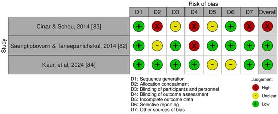 - Boutron, I.; Page, M.J.; Higgins, J.P.T.; Altman, D.G.; Lundh, A.; Hróbjartsson, A. Chapter 7: Considering bias and conflicts of interest among the included studies. In Cochrane Handbook for Systematic Reviews of Interventions Version 64; Higgins, J.P.T., Thomas, J., Chandler, J., Cumpston, M., Page, M., Welsh, V., Eds.; Cochrane: Hoboken, NJ, USA, 2023; pp. 8:1–8:73, updated August 2023; Available online: www.training.cochrane.org/handbook (accessed on 1 January 2020).