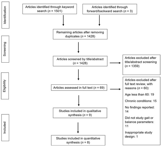 The initial search of databases yielded 1501 results. Three additional articles were identified through forward/backward search. After removing duplicates, 1428 articles were screened by title and abstract, and 69 articles were assessed in full text. Nine articles were included in the systematic review and eight articles in the meta-analysis [14,17,28,29,30,31,32,33,34]. The most common reasons for exclusion were including participants under 60 years of age (n = 19), including participants with chronic conditions (i.e., spinal cord injury, chronic kidney disease, multiple sclerosis) (n = 15), or not reporting findings (n = 14). Figure 1 depicts a flow diagram based on the Preferred Reporting Items for Systematic Review and Meta-Analysis guidelines.