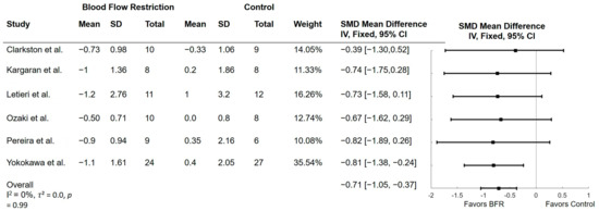 Seven studies examined the effect of BFR on the TUG. Three of the studies examined BFR with walking [17,28,29] while three examined BFR with low-intensity resistance training [14,33,34]. One study examined BFR with dual-tasking walking [32]. The results of these comparisons are shown in Figure 3. All studies found improvements in TUG time in the BFR groups compared to control. Time during the TUG significantly improved in BFR compared to control (mean difference (MD) = −0.71; 95% CI = −1.05, −0.37; p < 0.001). Heterogeneity was not significant with an I2 of 0% (p = 0.99) and τ2 of 0.0. One study was not included in the meta-analysis as SMD could not be calculated [28]. Results from Abe et al. [28] found that BFR with 20 min of walking improved TUG performance while those in the no exercise group did not improve TUG performance.