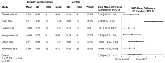 Six studies examined the effect of BFR on gait speed. Gait speed was extracted from the 6MWT (n = 3) [14,29,32], 400 m walk test (n = 2) [30,31], and 10 m walk (n = 1) [34]. Five studies examined BFR with low-load resistance training on gait speed [30,31,32,34,39] while two studies examined BFR with walking on gait speed [29,32]. The results of these comparisons are shown in Figure 4. Four studies found improvements in gait speed in the BFR group compared to control [14,29,30,32], while two studies found no significant differences between groups [31,34]. Three of the studies that demonstrated increased gait speed utilized the 6MWT [14,29,32], and the other utilized the 400 m walk test [30]. Meta-analysis indicated that there were no significant differences between BFR and control for gait speed (MD = 0.59; 95% CI = −0.22,1.41; p = 0.16). Heterogeneity was significant with an I2 of 83.1% (p < 0.001) and τ2 of 0.85.