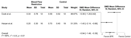 Two studies examined the effect of BFR on the Short Physical Performance Battery [30,31]. Both studies compared low-load resistance training with BFR to high-load resistance training or flexibility exercises. The results of these comparisons are depicted in Figure 5. Scores on the SPPB improved in the BFR group compared to control (MD = −0.94; 95% CI = −1.48, −0.39; p < 0.001). Heterogeneity was moderate with an I2 of 69% (p = 0.07) and τ2 of 0.35. One study reported gait speed from the 4 m walk test within the SPPB, but the second study did not. Cook et al. [30] found that gait speed increased across the entire sample.