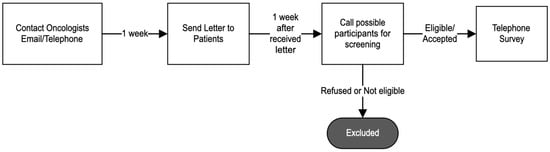 In collaboration with the PRCCR, one of the oldest population-based cancer registries in the world, a case ascertainment protocol was created to identify and recruit patients reported to the cancer registry (Figure 1). The list of possible participants who were diagnosed between 1 March 2017, and 31 August 2017, was provided by the PRCCR and included diagnoses from all of Puerto Rico. Participants identified using the PRCCR database were contacted by oncologists via email or telephone. With permission from their physicians, the possible participants were contacted via mail to invite them to participate and later through a phone call for eligibility screening. The telephone survey was performed between December 2019 and March 2021. We contacted a total of 398 potential participants. Of these, 73 declined to participate. Additionally, 35 participants had completed their treatment or diagnosis prior to the hurricanes. Another 23 individuals did not pass the Mini-Mental State examination. We also excluded 10 participants who did not reside in Puerto Rico either before or during the hurricanes. Furthermore, 8 participants were receiving treatment in the U.S.A. following the hurricanes, and 8 others were excluded for various other reasons. Among those contacted, 241 patients (140 with breast cancer and 101 with colorectal cancer) met the eligibility criteria for participation. Participants completed a computer-assisted telephone interview conducted by trained interviewers in Spanish, their native language, and received a financial incentive of $20 for their participation.