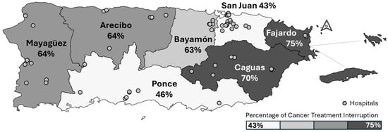 In Puerto Rico, the concept of “residence region” encompasses a variety of geographic and logistical factors that significantly influence healthcare access. The regionalization of services, conceptualized in 1958, aimed to guarantee access to healthcare services at different levels, from primary care in each municipality to secondary and tertiary care at the regional level. Health regions were divided into five regions based on population count, municipality geographic size and proximity, epidemiological characteristics, and political delimitations. During the 1970s, health regions were restructured into seven regions with the purpose of improving the operation of the public healthcare system [19]. The Health Resource and Service Administration (HRSA) classified 92.3% of Puerto Rico’s municipalities as medically underserved. The remaining healthcare workers available in Puerto Rico are unevenly located across the island, favoring the San Juan Metropolitan Area [20]. This uneven distribution of healthcare resources presents considerable difficulties in accessing consistent and timely cancer treatment in patients in areas distant from the San Juan Metropolitan Area. By analyzing treatment disruption across these defined health regions, this study aims to highlight how geographic and infrastructural disparities impact cancer patients’ ability to maintain continuous care, especially in the aftermath of natural disasters.