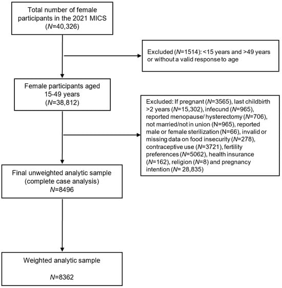 For this study, data on FI were obtained from the household file while data on contraceptive behavior were obtained from the women’s file. The analysis was restricted to women who were potentially at risk of pregnancy and included partnered (married or in union) women of reproductive age (15–49 years) who reported having at least one live birth within the two years prior to the survey. Observations were excluded for women who reported sterilization (either the female respondent or her current husband/partner), infertility, menopause, hysterectomy or being pregnant. Furthermore, individuals with missing data on FI, contraceptive behaviors, or covariates of interest were also excluded (Figure 1). As the sample was not self-weighting, the women’s sample survey weights included in the MICS dataset were used for analyzing and reporting results.