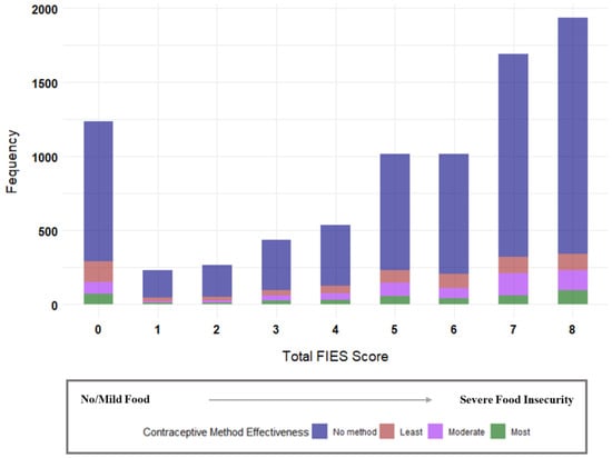 Total Food Insecurity Experience Scale (FIES) score and contraceptive method use.