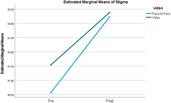 Pre- and post-training stigma toward others as a function of training modality.