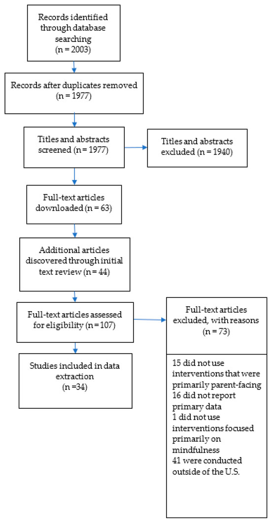 We included only intervention studies that reported empirical data; therefore, we excluded editorials, commentaries, perspective essays, case reports, and all reviews. Our inclusion criteria were further narrowed to include only studies that reported parenting-related outcomes and/or developmental outcomes for children, thereby excluding implementation and quality improvement studies that focused on program operations. Of note, we also reviewed the references within relevant systematic reviews and meta-analyses; however, we ultimately excluded all reviews during the screening process.