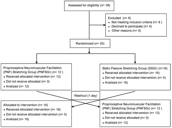 In the study, it was checked whether the caregivers of 38 children with developmental delays met the inclusion criteria. In the first stage, 30 caregivers who met the criteria were assigned to one of the proprioceptive neuromuscular facilitation (PNF) stretching group (PNFSGr) and the static passive stretching group (SSGr) using an online randomization method (www.randomiser.com). After the evaluations were made, the intervention procedure was applied and then the participants were evaluated again. A 1 day washout period was allowed to remove the effectiveness of the first application. One day later, the participants underwent a stretching procedure that was not applied in the first phase. The randomized controlled crossover study design is described in the flow diagram (Figure 1).