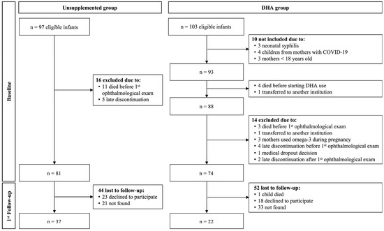 Details of the JoiDHA Study recruitment process were published previously [25]. Briefly, the JoiDHA study included mothers older than 18 years and newborns up to 33 weeks of gestational age (up to 32 weeks + 6 days) and/or with a birth weight ≤1500 g seen at the DVM hospital. The participants were recruited at two different times and divided into two groups: unsupplemented group (1 March 2020 to 8 June 2021, n = 81), which did not receive DHA supplementation, and DHA group (9 June 2021 to 31 January 2023, n = 74), which received DHA supplementation (Figure 1). Infants with ocular malformations who died before the first ophthalmological examination, infants who were transferred to a hospital in another city, and infants whose mothers had been supplemented with DHA or had infectious diseases (toxoplasmosis, syphilis, or corona-virus disease 2019 [COVID-19]) were excluded [25]. Of the 81 and 74 eligible infants in the unsupplemented and DHA groups, respectively, 22 and 37 participated in this study (Figure 1).