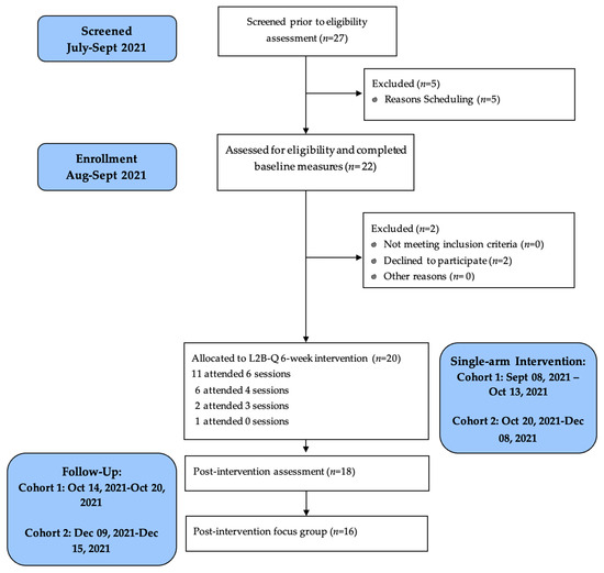 CONSORT study flow is presented in Figure 1. In terms of recruitment feasibility, 27 participants were screened prior to eligibility assessment. Twenty-two participants were assessed for eligibility, with only two declining to participate in the intervention. Thus, 20 participants were enrolled within a 12-week time frame, exceeding the goal of enrolling at least ten participants within 12 weeks.