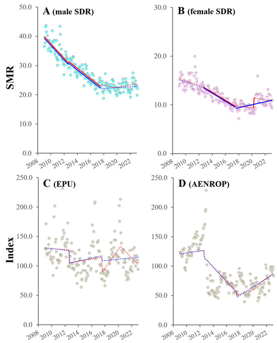 Fluctuation in SDRs and uncertainty indices (EPU: economic policy uncertainty, and AENROP: government management instability) from January 2009 to June 2023 in Japan. Panels (A–D) indicated the trends and discontinuity of SDRs among males and females, EPU and AENROP, from January 2009 to June 2023 in Japan, respectively. Ordinates indicate the SDR (per 100,000 in the population) in panels (A,B) and EPU and AENROP indices in panels (C,D). Blue and red circles indicate the observed annualized monthly SDRs of males and females, respectively. Grey circles indicate the observed uncertainty indices value. Blue and red lines indicate the results calculated by ITSA with interventions from three GPSPP periods alone and GPSPP periods alongside the COVID-19 pandemic outbreak, respectively. Solid and dotted lines indicate the significant and non-significant trends or discontinuity detected by ITSA, respectively.