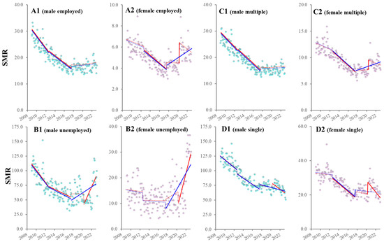 Fluctuation in SMRs disaggregated by social standing from January 2009 to June 2023 in Japan. Panels (A–D) indicate the trends and discontinuity of SMRs of employed, unemployed individuals, multiple-person and single-person household residents from January 2009 to June 2023 in Japan, respectively. Panels (A1–D1) and (A2–D2) indicate male and female SMRs disaggregated by social standing, respectively. Ordinate and abscissa indicate the SMR (per 100,000 population) and years, respectively. Blue and red circles indicate the observed annualized monthly SMRs of males and females, respectively. Blue and red lines indicate the results calculated by ITSA with interventions of GPSPP alone and GPSPP with the COVID-19 pandemic outbreak, respectively. Solid and dotted lines indicate the significant and non-significant trends or discontinuity of SMRs detected by ITSA, respectively.