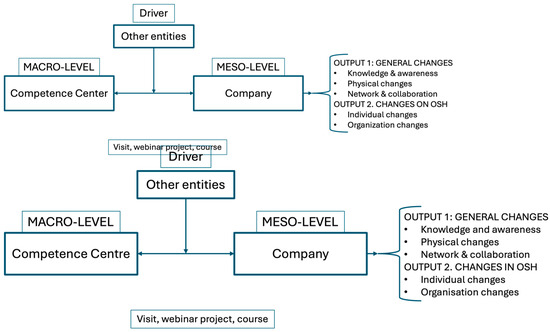 - Output 1—generic changes in the company and its performance. These effects represent the possible generic changes that directly affect the company, its organisation, and its performance through interaction with the CC. Output 1 comprises three macro-categories: knowledge and awareness, physical change, and network and collaboration.