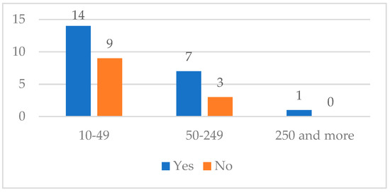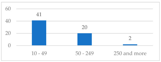 The total number of companies that responded to the survey and contributed to this study is 89. However, after cleaning the collected data, 26 questionnaires were excluded from the analysis because they were incomplete. As a result, 63 companies, including 41 small businesses, 20 medium-sized businesses, and 2 large businesses, constitute the dataset of valid responses (Figure 2). This reflects, as previously illustrated, the Italian entrepreneurial landscape, which is primarily characterized by small enterprises, with a smaller presence of medium and large enterprises.