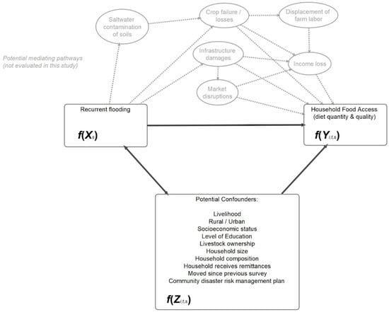 It is known that climate events are impacting food security around the world through direct losses to agricultural crops, presenting a major challenge to food and nutrition security through many pathways [1,2,3,4,5]. In the 6th Assessment Report, the Intergovernmental Panel on Climate Change (IPCC) estimates increased nutrition-related diseases and undernourishment because of ongoing climate changes [5]. Flooding, caused by significant variations in rainfall patterns and other factors, is threatening our food system [1,2]. The FAO reports that drought and flood are the greatest culprits of agricultural production loss and estimates that these production losses lead to loss of calories and nutrients [2]. The impacts to household diet and nutrition, however, are not well understood. While increased rainfall has been shown to have a positive effect on diet diversity in some regions, the current evidence base for flooding is poor [3,6].