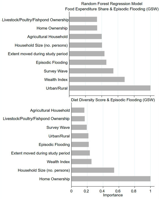 In random forest models, flooding had more predictive importance for food expenditure share than for diet diversity in relation to the other variables (Figure 3).