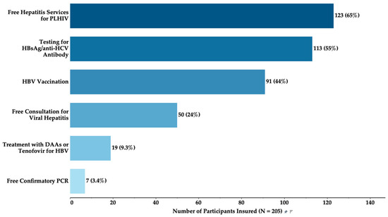 A variety of hepatitis services were covered by health insurance among participants insured (Figure 1). The most common service covered was testing for the HBsAg/anti-HCV antibody (55%), followed by HBV vaccination (44%). Free hepatitis services for PLHIV were available to 65% of participants. Free consultation for viral hepatitis was available to 24%, while treatment with DAAs for HCV or Tenofovir for HBV was accessible to 9.3%. Only 3.4% had access to free confirmatory PCR tests.