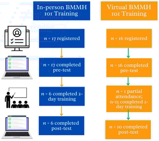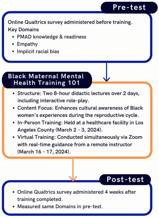 We conducted an educational feasibility study with two separate cohorts of healthcare providers. The first cohort attended the 2-day in-person Black Maternal Mental Health Training (BMMH 101), while the second cohort attended virtually (Figure 1).