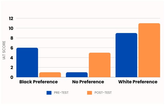 In examining IAT group changes from pre-test to post-test, more participants were grouped in the ‘No preference’ and ‘White preference’ groups, post intervention. These differences approached statistical significance (p = 0.06, Figure 3).
