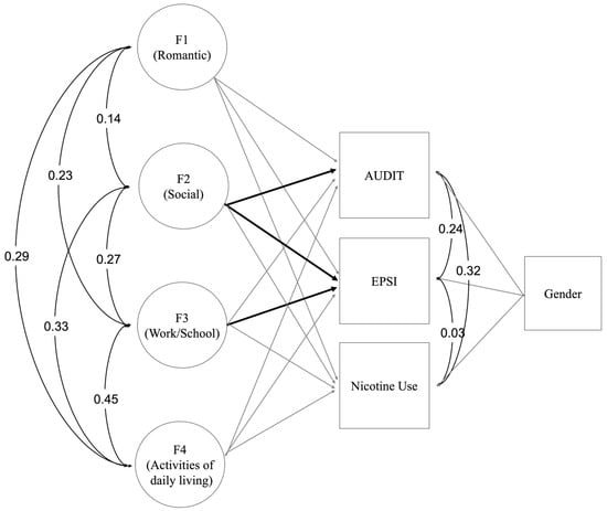 The results indicate that social-related environmental reinforcement was significantly positively associated with both alcohol consumption (β = 0.30, p < 0.001) and binge eating behaviors (β = 0.26, p < 0.001). For every standard deviation increase in the social-related environmental reinforcement factor, alcohol use and related problems were 0.30 standard deviations higher, and binge eating behaviors were 0.26 standard deviations higher on average. The results also indicate that work/school-related environmental reinforcement was significantly negatively associated with binge eating behaviors (β = −0.14, p = 0.014). For every standard deviation increase in the work/school-related environmental reinforcement factor, binge eating behaviors were 0.14 standard deviations lower on average. The work/school-related environmental reinforcement factor was not significantly associated with alcohol use and related problems (Table 4). None of the environmental reinforcement factors was significantly associated with nicotine use (Table 4).