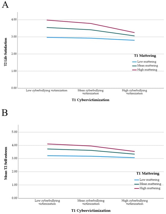 (A) graphical representation of the interaction between T1 CV and T1 mattering predicting T2 life satisfaction (see panel (A) above) and T2 self-esteem (see panel (B) above).