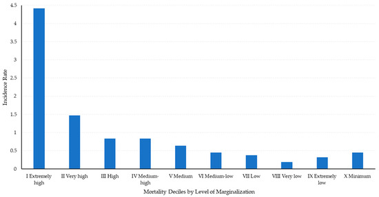 The 8083 child deaths that occurred in Mexico from all causes were classified into clusters according to the socioeconomic level of the localities, as defined by the IMG of the CONAPO [20]. The IMG ranges from zero to one, with its value reflecting the socioeconomic conditions of the communities: values close to one indicate poor conditions, while values close to zero indicate very favorable conditions. Thus, deaths of school-aged children were ordered by the IMG value of the locality where they were recorded and classified into 10 groups (deciles) with an equal number of deaths, numbered from I to X. Each decile includes deaths in localities with similar socioeconomic levels. Decile I groups 10% of the deaths in localities with an extremely high level of marginalization, while Decile X includes 10% of deaths in localities with the lowest level of marginalization (see X-axis, Figure 2).