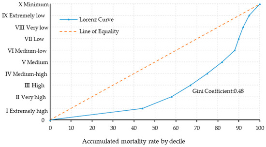 To measure the degree of inequality in the distribution of child mortality in Mexico, the database that records the total deaths of school-aged children from all causes is used. This database is sorted according to the Index of Marginalization (IMG) of the localities, which denotes their socioeconomic level according to the National Population Council (CONAPO in Spanish) [20]. IMG is based on indicators related to the communities, including education (illiteracy and lack of basic education), housing conditions (lack of access to water, electricity, or sanitation, and overcrowding), and income level (percentage of the population earning less than two minimum wages). The index rates each community on a gradient ranging from high to very low levels of marginalization. Based on this information, the Lorenz curve is estimated, and the Gini coefficient is calculated, quantifying the inequality in the distribution of child mortality among the different deciles, which reflect 10 groups classified by the socioeconomic level of their locality.