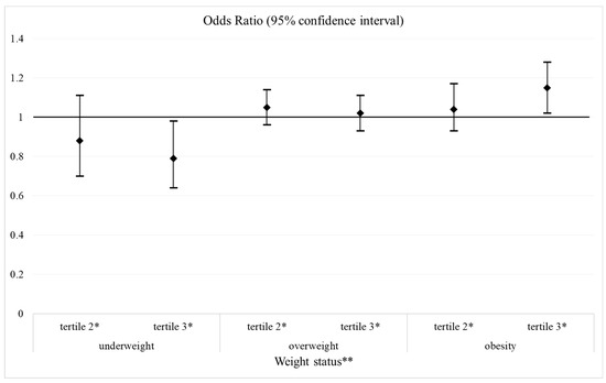 Compared to those in the first tertile of the evening/morning energy intake ratio, individuals in the third tertile had a greater chance of obesity (OR = 1.15; 95% CI = 1.02; 1.28, p = 0.018) and lower chance of underweight (OR = 0.79; 95% CI = 0.64; 0.98, p = 0.029) (Figure 1).