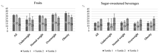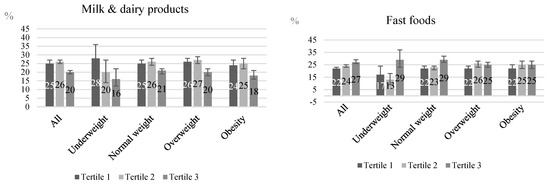 Furthermore, differences in the report of food group consumption across the tertiles of the evening/morning energy intake ratio were independent of the weight status, as exemplified in Figure 2 for milk and dairy, fast foods, fruits, and sugar-sweetened beverages.