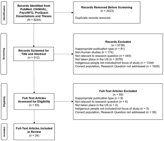 Our search resulted in a total of 8244 records when using the search strategy in CINAHL (EBSCOhost), PsycINFO (EBSCOhost), and ProQuest Dissertations & Theses Global (Figure 1). Utilizing DistillerSR, the total number of records were screened for duplications, and 2423 were removed. The total number of records remaining after duplications was 5281.
